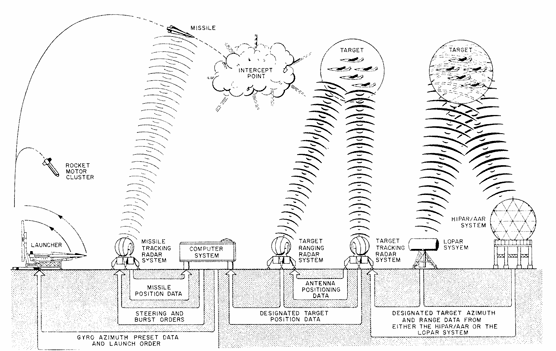 Illustration of how the Nike syA U.S. Army diagram illustrating the Nike fire control sequence. Three separate radar systems worked in coordination: acquisition radar identified the incoming aircraft, target tracking radar locked onto it continuously, and missile tracking radar followed the interceptor from launch through detonation. The ground-based computer calculated the intercept point in real time. The missile itself carried no seeker. U.S. Army.stem functioned. The target is acquired by Acquisition Radar, then tracked by Target Tracking Radar. A missile is launched, and its path is tracked by Missile Tracking Radar. The enemy is then intercepted in the sky before reaching the city. U.S. Army