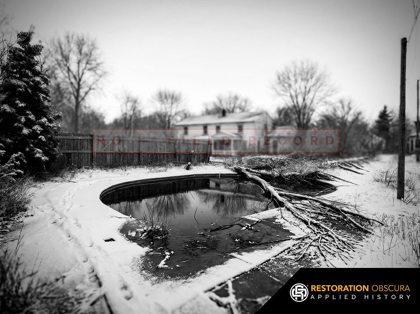 The in-ground pool I photographed on one of the neighborhood’s side streets demonstrated a different kind of transformation. These domestic amenities are engineered to function within maintained systems. Filtration. Chemical treatment. Seasonal opening and closing. Remove that maintenance and they become something else. The storm had followed abnormally warm weather. The pool held dark water rather than ice, collecting precipitation and runoff. It functioned as a catch basin for the site’s hydrology, a depression in the landscape where water gathered. Vegetation had established around its perimeter. Given another decade without intervention, the concrete shell would crack as tree roots penetrated. Soil would fill the depression. The pool would disappear into the ground that surrounds it. The physical record of its existence would vanish.